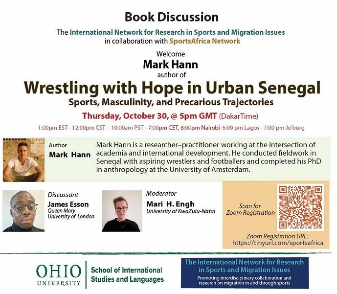 We are delighted to announce the network's upcoming online book discussion in collaboration with SportsAfrica Network on Thursday, 30th October @5pm GMT on Zoom. Network member James Esson (Queen Mary University London) will discuss Mark Hann's recently published book "Wrestling with Hope in Urban Senegal. Sports, Masculinities and Precarious Trajectories". Mari Engh (University of KwaZulu-Natal) will moderate the discussion.